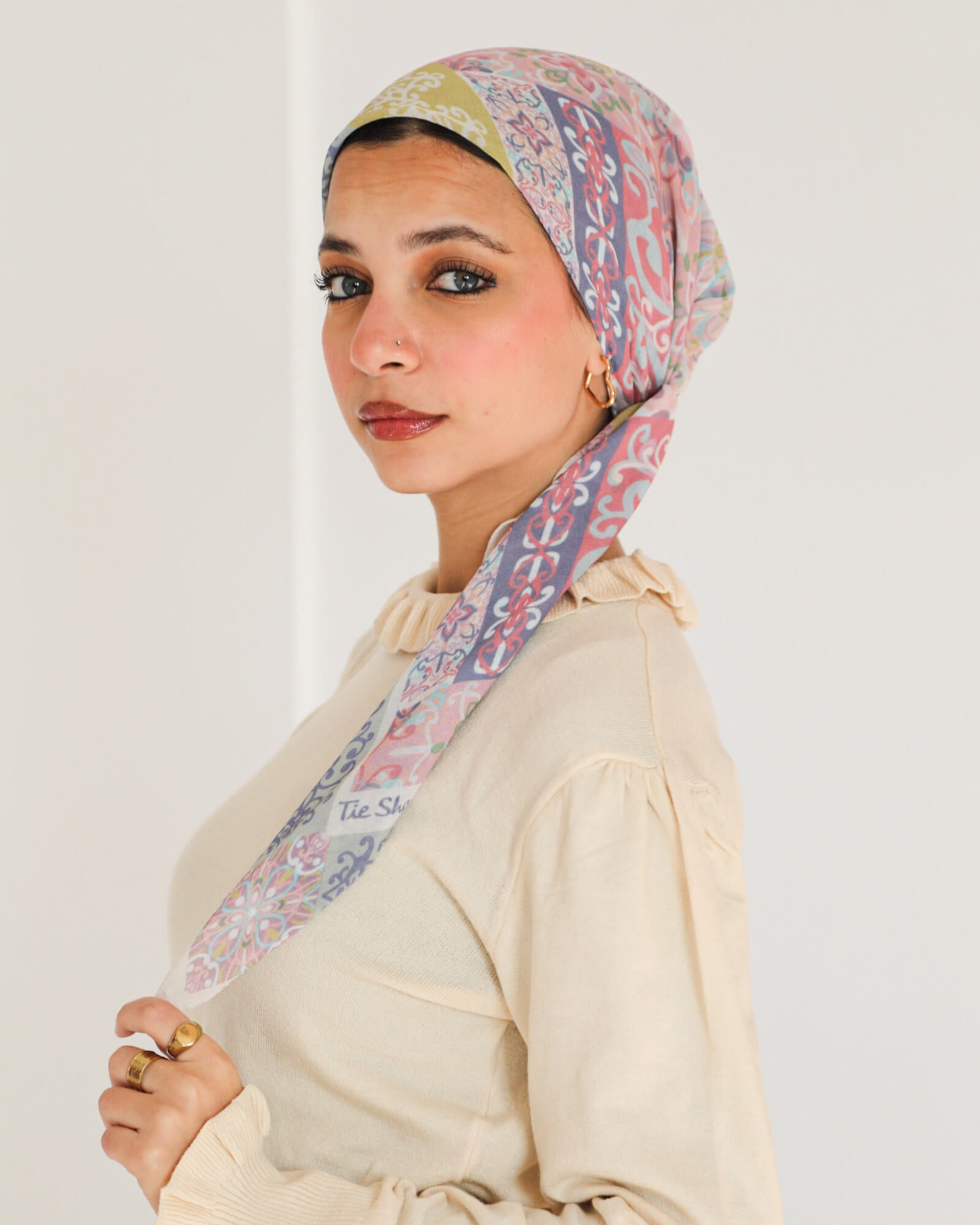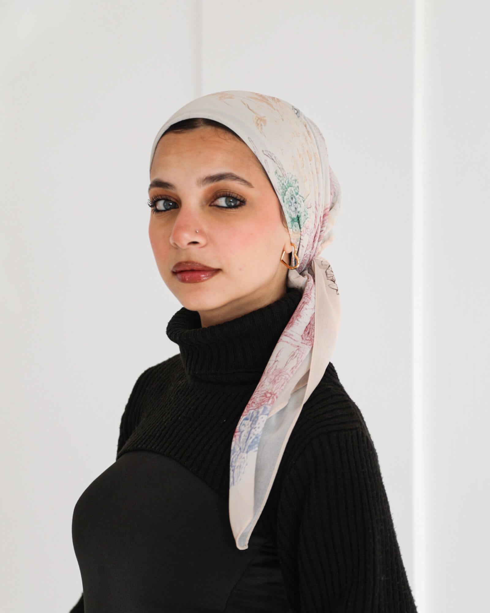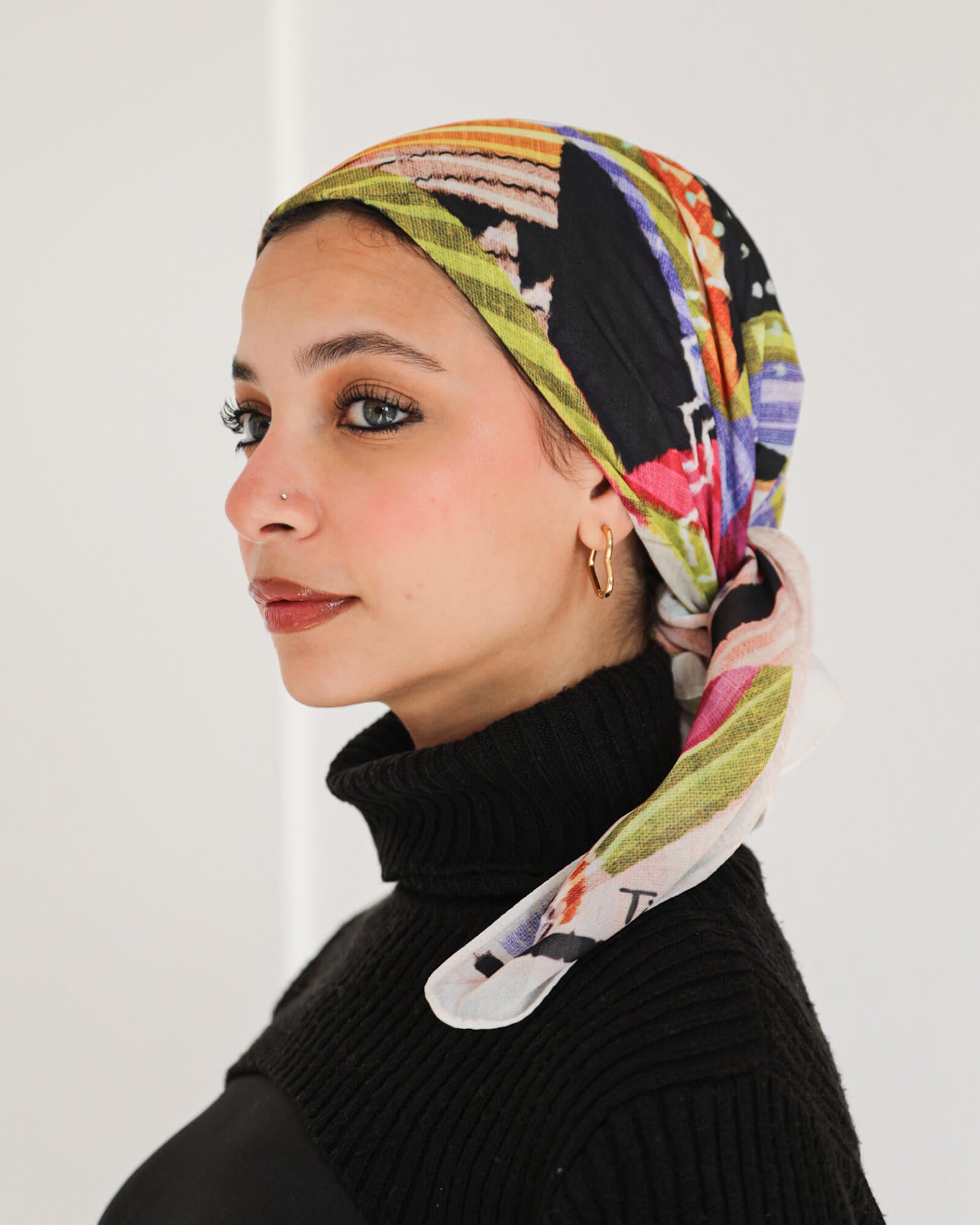 For a quick hijab style change, try our Square Printed Crepe Chiffon. Its designs and colors are very vibrant and the fabric is so soft.